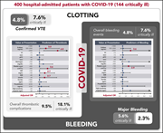 The authors present a retrospective analysis of bleeding and thrombosis in 400 patients hospitalized with COVID-19. They report venous thromboembolism and bleeding rates of 9.5% and 4.8%, respectively, and confirm the predictive value of elevated D-dimer levels for thrombosis, bleeding, and death.