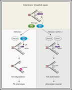 Fanconi anemia (FA) is a DNA repair disorder associated with sensitivity to interstrand cross-linking agents such as mitomycin C. FA proteins promote cross-link repair, but they also protect stalled replication forks generated by stress replication. Okamoto and colleagues demonstrate that in the absence of FA proteins, the DNA/RNA helicase SLFN11 promotes nuclease destruction at replication forks and SLFN11 knockdown reduces fork degradation and improves cell survival of FANCD2 knockout cells.
