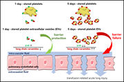 About half of transfusion-related acute lung injury (TRALI) is related to transfusion of allogeneic antibodies that damage the recipient endothelium, but nonimmune TRALI is not well understood; studies suggest it is increased in relation to platelet-storage time. McVey and colleagues related this storage lesion to platelet extracellular vesicles (EVs), demonstrating that time in storage increases the number of EVs and shifts their content toward ceramide, which disrupts the lung endothelial barrier.