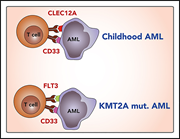 Willier and colleagues report that the expression of target molecules for immunotherapy in pediatric acute myeloid leukemia (AML) differs from expression profiles in adult AML. On the basis of their study of 36 cases, they identify CLEC12A and CD33 as preferential immunotargets for combined targeting in pediatric AML. They also nominate the combination of CD33 and FLT3 as immunotargets specific for KMT2A-mutated infant AML.