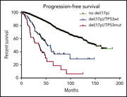 Deletion of the short arm of chromosome 17 [del(17p)] is associated with poor prognosis in multiple myeloma, but there is a controversy whether poor outcome is restricted to those with del(17p) who also have a somatic mutation in their residual TP53 gene (“double hit”). In a study of 121 patients with del(17p) compared with 2505 patients without del(17)p, the authors report that although the outcome in the setting of the p53 double hit is the worst, del(17p) alone also confers a negative prognosis.