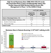 Shah et al report results of a phase 1 trial of KTE-X19 anti-CD19 chimeric antigen receptor (CAR) T-cell therapy in 45 adults with relapsed/refractory acute lymphoblastic leukemia (ALL). Complete remissions, all of which were minimal residual disease negative, were achieved in 69% of patients, and in 83% of patients receiving the highest dose, which is the dose in the ongoing phase 2 trial.