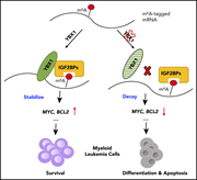 RNA-binding proteins (RBPs) regulate gene expression by modulating transcription, translation, posttranslational modification, and RNA stability. Feng et al demonstrate that YBX1 is an RBP that is upregulated in AML cells, where it interacts with and stabilizes m6A-tagged RNA, including BCL2 and MYC. YBX1 deletion induces messenger RNA decay of MYC and BCL2 transcripts and increases differentiation and apoptosis in mouse AML and in human primary AML cells without any effect on normal hematopoietic stem cells, suggesting a potential novel pathway to target in leukemic stem cells.