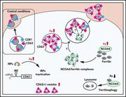 Confocal microscopy image showing iron repletion leads to colocalization of NCOA4 (green) and CD63 (red) into the same vesicles (yellow). These data are vital for understanding iron regulated ferritin secretion via CD63+ extracellular vesicles. See the article by Yanatori et al on page 1490.
