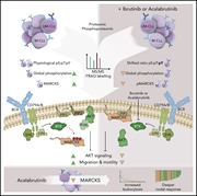 Beckmann et al report on phosphoproteomic analysis of immunoglobulin heavy-chain variable gene (IGHV)—mutated and unmutated chronic lymphocytic leukemia (CLL) cells to provide insight into response to Bruton tyrosine kinase (BTK) inhibitors. The 2 groups showed striking differences, with unmutated CLL (UM-CLL) having higher basal phosphorylation levels than mutated CLL. The study focused on MARCKS, which is much more highly expressed and phosphorylated in UM-CLL and modulates cell migration, perhaps explaining the higher treatment-induced leukocytosis and decreased nodal disease in UMCLL when exposed to BTK inhibitors.