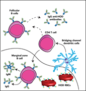 Alloimmunization is a major problem in chronically transfused patients. Using transgenic red cells expressing a model surface antigen, Zerra et al uncovered a unique immune response pathway involving CD4 T cell–dependent extrafollicular immunoglobulin G response against a red cell antigen mediated by marginal zone (MZ) B cells. They also show that even transient depletion of MZ B cells can prevent alloimmunization in murine models, speaking to the potential of these discoveries to have therapeutic relevance.