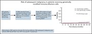Steffin and colleagues report on the development of secondary malignancies in 340 patients treated with genetically modified immune effector cells (IECs) from 27 different clinical trials over more than 1000 patient-years of follow-up. Secondary malignancy was seen in 16 patients (3.6%), comparable to what is seen with standard chemotherapy alone. Reassuringly, in 11 available biopsies, none carried the transgene, suggesting that IECs modified with gammaretroviral vectors do not increase the risk of secondary malignancy.