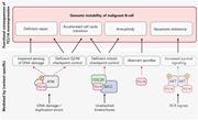 Proposed integrative model of oncogenic TCL1A through the promotion of genomic instability in malignant B-cells. Overexpression of TCL1A causes genomic instability via multiple pathways: (i) deficient repair of DNA damage, (ii) an accelerated cell cycle transition, (iii) susceptibility to aneuploidy (data for i-iii presented in this report), and (iv) apoptosis resistance (published before). Key molecules through which these effects (i.e. via physical interaction with TCL1A) are mediated are highlighted. We show here that overexpression of TCL1A leads to a decreased phosphorylation of ATM and reduced expression of p53 upon genotoxic stress. This might cause impaired sensing and processing of DNA insults (exogeneous or as part of DNA replication), and deficient G2/M checkpoint control, contributing to (i) and (ii). The interaction of TCL1A with molecules from the mitotic checkpoint complex (MCC), including CDC20, might form the basis of the observed accelerated cell cycle transition by deregulating the mitotic checkpoint, contributing to (ii) and (iii). Furthermore, the high frequency of aberrant spindles seen in TCL1A-overexpressing cells promotes the observed aneuploidy. The already well-established role of TCL1A in augmenting AKT phosphorylation6,13,16 leads to increased survival signaling and thereby to apoptotic resistance (perturbation of a safeguarding mechanism). Together, TCL1A overexpression leads to a premature, DNA-damage-prone cell cycle checkpoint transition, which contributes to the TCL1A transforming capability in concert with impaired repair and hyperactive pro-survival signaling.