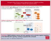 Protein arginine methyltransferase 5 (PRMT5) is an epigenetic regulator of many potentially oncogenic processes and is overexpressed in mantle cell lymphoma (MCL). Sloan and colleagues used cell lines, primary patient samples, and patient-derived xenografts to reveal that PRMT5 inhibition reverses cell-cycle deregulation, promotes apoptotic cell death, and reactivates negative regulators of B-cell receptor signaling in relapsed MCL. The authors’ data identify potential biomarkers for sensitivity of MCL to PRMT5 inhibition, providing a basis for future clinical trials.