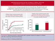 In this Plenary Paper, Wadhwa et al report on a secondary analysis of the Children's Oncology Group AALL03N1 study, correlating outcomes of acute lymphoblastic leukemia with Census Bureau data detailing household income. Among 592 patients, those with incomes below 120% of federal poverty thresholds (termed extreme poverty) comprised 12%. Those living in extreme poverty have a higher rate of relapse, only partially mitigated by a higher rate of nonadherence to maintenance mercaptopurine.