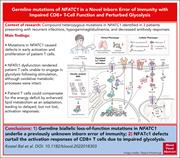 The nuclear factor of activated T cells (NFAT) family of transcription factors is important for immunity in murine models, but their role in human immune function is unknown. Kostel Bal et al analyzed 3 members of a family pedigree with germ line biallelic missense mutations in NFATC1 presenting with recurrent infections, hypogammaglobulinemia, and decreased antibody responses. The authors demonstrate a defect in T-cell activation arising from defective glycolysis that is partially compensated by enhanced lipid metabolism.
