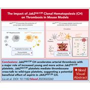 Jak2V617F (Jak2VF) is a major driver of BCR::ABL-negative myeloproliferative neoplasms but is also a common mutation in clonal hematopoiesis (CH). Jak2VF CH is associated with atherothrombotic disease, but its mechanism is unclear. Liu et al confirmed in mouse models that Jak2VF CH at a variable allele frequency of 1.5% is sufficient to confer an activated phenotype on both normal and Jak2VF CH platelets, suggesting that aspirin might confer protection from atherothrombosis in patients with Jak2VF CH.