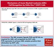 Immunotherapy of acute myeloid leukemia (AML) with γδ T cells is being promoted because γδ T cells are not HLA-restricted and do not represent antigen via presentation by HLA, making them excellent candidates for off-the-shelf immunotherapy. Mensurado et al set out to elucidate AML cell recognition by Vδ1+ T cells (Delta One T [DOT] cells). The authors identified CD155/pulmonary vascular resistance (PVR) as the major protein allowing activation of DOT cells, suggesting that PVR expression may predict success of immunotherapy with DOT cells.