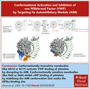 Activation of von Willebrand factor (VWF) is modulated by the A1 domain with surrounding elements that constitute an autoinhibitory module (AIM), but the details of the AIM structure and function are not clear. Arce et al performed a targeted screen to identify nanobodies binding to the N-terminal (NAIM) and the C-terminal (CAIM) domains. Nanobodies binding the NAIM sequence activate VWF and induce platelet activation, while those binding the CAIM inhibit ristocetin-induced platelet aggregation and reduce VWF-mediated platelet adhesion. Crystal structure suggests a direct interaction between NAIM and CAIM to modulate its conformation, and nanobodies can either stabilize or disrupt its inhibitory conformation.