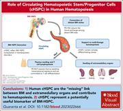 Quaranta and colleagues investigated the phenotype and role of circulating hematopoietic stem/progenitor cells (cHSPCs) in humans. Using immunophenotyping, transcriptome sequencing, functional assays, and clonal tracking, the authors demonstrated that cHSPCs decline with age, are enriched for early committed progenitors, and have a transcriptional profile that differs from their marrow counterparts. cHSPCs are poised for differentiation and seed hematopoiesis at extramedullary sites.