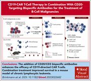 Anti-CD19 chimeric antigen receptor (CD19-CAR) T-cell administration has excellent efficacy in treating relapsed lymphoma, but many patients relapse. Brinkmann et al assessed the effect of coadministration of CD20-targeting bispecific antibodies (CD20-BsAbs) with CD19-CAR T cells to enhance treatment effects. The addition of CD20-BsAbs to CD19-CAR T cells improved malignant cell killing and expansion of both endogenous T cells and CD19-CAR T cells. This combination improved response in a mouse model of chronic lymphocytic leukemia (CLL), offering a potential novel approach to improving CAR T-cell therapy.