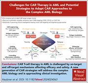 The treatment of acute myeloid leukemia (AML) continues to be challenging as the prognosis remains poor despite recent advances in the molecular characterization of the disease. Chimeric antigen receptor (CAR) T-cell therapy has been effective for B-cell lineage leukemias but not for AML. In this review, Haubner and colleagues describe preclinical and clinical studies of CAR T cells for AML, outline the challenges that must be overcome to achieve durable antileukemic responses, and propose novel strategies to increase therapeutic efficacy.
