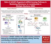 Immunomodulatory drugs (IMiDs) like lenalidomide are part of standard-of-care treatment for multiple myeloma (MM). Koh et al report a novel mechanism of resistance to lenalidomide involving adenosine deaminase acting on RNA1 (ADAR1). The study showed that lenalidomide triggered the double-stranded RNA (dsRNA)–sensing pathway in MM cells, inducing interferon-mediated cellular apoptosis. Loss of ADAR1 caused endogenous dsRNA accumulation and enhanced lenalidomide sensitivity, opening a therapeutic window for ADAR1 inhibition to potentially synergize with current IMiD treatment.