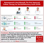 Acute graft-versus-host disease (aGVHD) contributes substantially to early post–allogeneic stem cell transplant morbidity and mortality, especially if there is not a prompt response to steroids. Recently, the FDA approved remestemcel-L-rknd (Ryoncil), an off-the-shelf mesenchymal stromal cell (MSC) therapy for children with steroid-refractory aGVHD. In this Blood Spotlight, Etra and colleagues highlight the preclinical data suggesting how MSCs modulate GVHD and the clinical data that underpin the approval, while posing key questions that remain unanswered about this novel approach.