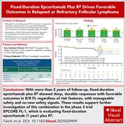 The CD3×CD20 bispecific antibody epcoritamab synergizes with both lenalidomide and rituximab in preclinical models. Falchi and colleagues report an open-label, multicenter phase 1b/2 study evaluating fixed-duration epcoritamab with rituximab and lenalidomide (R2) in 108 patients with relapsed or refractory follicular lymphoma. Efficacy was impressive in these predominantly high-risk patients, with 88% achieving a complete response, many with elimination of measurable residual disease, and 76% remaining progression free at 2 years, while cytokine release syndrome, neutropenia, and infections are common toxicities. Phase 3 trials are now in progress.