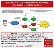 The progression of multiple myeloma (MM) is often associated with the suppression of ferroptosis, a type of cell death driven by iron-dependent lipid peroxidation. Yan et al investigated mechanisms underlying MM resistance to ferroptosis and found that STK17B phosphorylates key regulators of iron homeostasis, thereby maintaining a balance between proferroptotic and antiferroptotic proteins. Pharmacological inhibition of STK17B activates ferroptosis, overcomes MM drug resistance, and reduces tumor burden in mouse models, suggesting a potential targeted therapy to overcome drug resistance in myeloma.