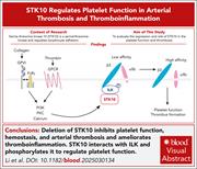 Serine/threonine kinase 10 (STK10) is a serine/threonine kinase and regulates lymphocyte adhesion. Li et al evaluated the expression and role of STK10 in platelet function and thrombosis, demonstrating that deletion of STK10 inhibits platelet function, hemostasis, and arterial thrombosis and ameliorates thromboinflammation. Mechanistically, STK10 interacts with integrin-linked protein kinase and phosphorylates it to regulate platelet function. This newly defined role for STK10 in platelet functions offers potential therapeutic opportunities.