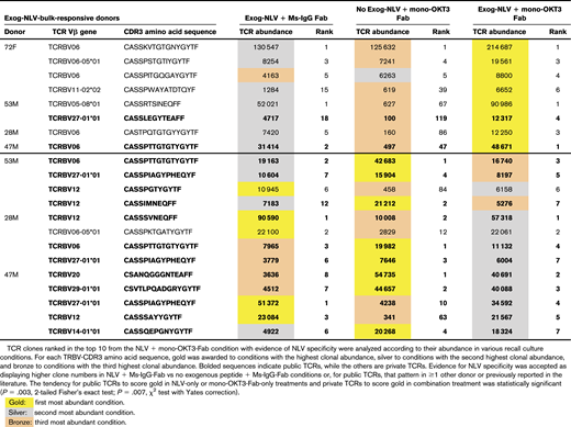 The other 3 exog-NLV-bulk-responsive donors showed similar examples of clonal responses (Figure 4F-H), while unlike donor 72F, the others had exogenous NLV-responsive public TCRs (supplemental Table 3A) among top clones, which in 12 out of 14 occurrences responded to mono-OKT3-Fab (supplemental Table 3B). However, there was a curious pattern in their response: public clones tended to respond best to either mono-OKT3-Fab only or exogenous NLV but less optimally to the combination. Assigning first-place performance (“gold”) to conditions with highest clonal abundance and second/third-place (“silver-bronze”), we found that considering all top 10 clones, private much more than public TCRs showed synergy in combination treatment (Table 1).