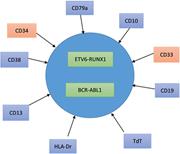 Fluorescence in situ hybridization image of B-cell acute lymphoblastic leukemia nuclei, using the MetaSystems BCR-ABL1 dual fusion probe, showing an atypical abnormal pattern. The signal pattern shows 2 copies of ABL1, 1 copy of BCR, and 1 fusion signal, consistent with BCR-ABL1 gene rearrangement. The patient also had an ETV6 gene rearrangement in the same nuclei. See the article by Dun et al. - PDF Icon Front MatterFront Matter