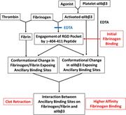 Snapshot at 230 ns from molecular dynamics simulations of a representative structure of αIIbβ3 headpiece-fibrinogen γ-module complex showing a relaxed model of fibrinogen γ-module binding to αIIbβ3. Fibrinogen, αIIb, and β3 are colored gray, blue, and red, respectively. The last 7 amino acids of the fibrinogen γ-chain are colored yellow. See the article by Zafar et al. - PDF Icon Front MatterFront Matter