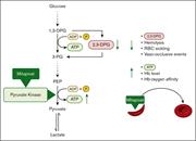 Effects of mitapivat-mediated pyruvate kinase activation in sickle cell disease. Mitapivat (AG-348) is an oral allosteric activator of pyruvate kinase (PK), a key enzyme in RBC glycolysis. PK activation decreases 2,3-DPG levels and increases ATP levels in RBCs. This study showed that mitapivat decreased parameters of hemolysis, RBC sickling and vaso-occlusive events and increased hemoglobin (Hb) level and Hb-oxygen affinity.1,3-DPG, 1,3-Disphosphoglycerate; ADP, adenosine diphosphate; P, phosphate; 2,3-DPG, 2,3-diphosphoglycerate; ATP, adenosine triphosphate; 3-PG, 3-Phosphoglycerate; PEP, phosphoenolpyruvate; RBC, red blood cell; Hb, hemoglobin.