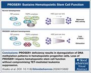Illustration of the roles of PROSER1 and TET2 in the regulation of DNA methylation and hematopoiesis. PROSER1 is a pan-TET interactor important for maintenance of DNA methylation homeostasis in hematopoietic cells. Loss of PROSER1 results in disruption of TOPD (TET-OGT-PROSER1-DBHS) complexes and overlapping and distinct enhancer DNA methylation changes compared to changes observed in TET2 knockout cells. These DNA methylation changes and the resulting deregulation of genes governing cell cycle and hematopoietic stem cells (HSCs) likely drive the observed exhaustion of HSC activity over time. See the article by Knatko et al.