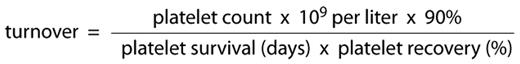 A more dynamic measurement of platelet production requires an understanding of the “steady state,” i.e., when the peripheral blood platelet count is stable. At a stable count, platelet production must equal platelet destruction and the number of platelets going into or out of the system every day, “turnover,” must be constant. Harker and Finch first described methodology for 51Cr labeling platelets to measure platelet disappearance rates and, by implication, production.3 The number of platelets entering and leaving the circulation every day can be calculated by the formula: