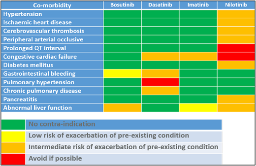 The currently available TKIs have a variety of adverse effects, some of which can be attributed to inhibition of off-target tyrosine kinases, and are common to all the drugs. However, each of the drugs has a particular adverse event profile that should be considered when choosing first-line therapy. The European LeukemiaNet recently reviewed the occurrence and management of TKI adverse effects,51 so the following discussion refers to adverse effects only in the context that they might direct the choice of drug.