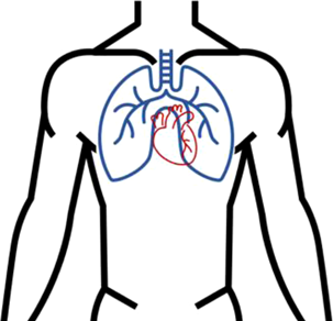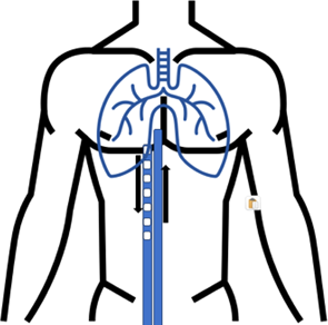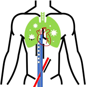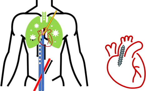 | The first figure shows extensive consolidation of the lung field secondary to coinfection with influenza and group A streptococcus. The patient was placed on bifemoral venovenous ECMO. The return cannula is placed just at the atrial caval junction. The access cannula for drawing in blood sits approximately 5 to 10 cm below the return cannula to prevent the recirculation of freshly oxygenated blood. |