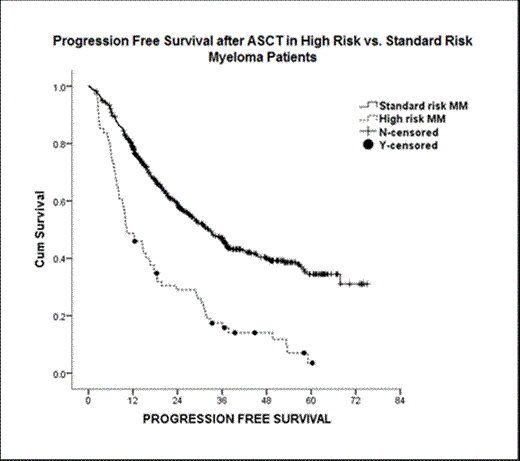 Metaphase CC and FISH data was collected from medical records of MM pts who underwent ASCT at our institution between Jan 2005 to Dec 2009. HR-MM pts were defined if CC revealed deletion (del) of chromosome 13/13q, del17/17p, t(4;14), t(14;16), hypoploidy (<45 chromosomes excluding –Y), or chromosome 1 abnormalities [+1, -1, t(1;x)] in at least 2 metaphases; or if FISH showed del 17p, t(4;14). Kaplan & Meier method was used for assessing progression free survival (PFS) and overall survival (OS); log-rank test was used to evaluate the difference between pt groups and Cox proportional hazards models were fitted for multivariate analysis.