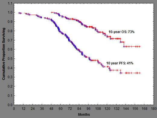 Patient characteristics and outcomes are shown in the attached Table. The median age at auto-HCT was 56 years, and the median time from diagnosis to auto-HCT was 7.5 months. Twenty-three (13%) patients had ≥ 10% plasma cells in the bone marrow at auto-HCT and only 9 patients (4.8%) had high-risk cytogenetic abnormalities. One-hundred and fifty (77%) patients received induction therapy containing either an immunomodulatory (IMiD) agent or a proteasome inhibitor (PI). At the time of the auto-HSCT, only 13 (6.7%) patients were in CR and 38 (19.6%) were CR or VGPR after induction therapy (Table). One-hundred and sixty three (84%) patients received mephalan alone as conditioning regimen. Eighty-one (42%) patients received post auto-HCT maintenance. Eighty (41%) patients achieved a CR, while 104 (54%) achieved CR + VGPR after auto-HCT. Six patients (3.1%) developed a second primary malignancy post- autologous transplant. After a median follow-up of 95.4 months, median PFS was 97.3 months and median OS has not been reached. The 10-year PFS and OS were 41% and 73% respectively. Use of melphalan alone as preparative regimen was associated with a longer PFS and OS (p=0.004 and 0.004, respectively). Achievement of CR after auto-HCT was associated with a longer PFS only (p=0.001), and the use of IMiD or a PI as induction was associated with a longer OS (p=0.01).