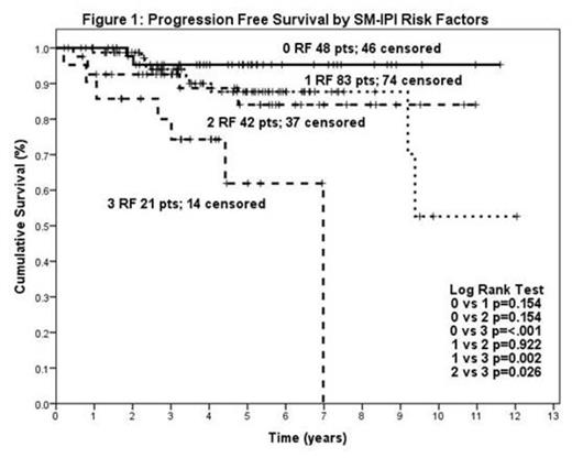 262 pts were identified with median age 58 years (range 18-85), 55% female (N=145), and 30% stage I (N=82), 37% Stage IE (N=96), <1% stage IXEE (N=1), 18% stage II (N=46), and 14% Stage IIE (N=37). The factors associated with inferior progression-free survival (PFS) were age > 60 (p=0.039), elevated LDH (p=0.014), and stage II disease (p=0.015). In contrast, female sex (p=0.54), B-symptoms (0.74), presence of extranodal “E” lesion (p=0.12), and poor performance status (0.35) were not significantly associated with PFS. The stage-modified IPI (SM-IPI, including the factors: stage II (vs. I), age>60, elevated LDH, and ECOG performance status ≥2) stratified patients into prognostically relevant groups, see Figure 1. In the rituximab era, the poorest outcomes were observed in patients with SM-IPI=3 (n=21). Interim PET imaging after 3-4 cycles (interpreted with International Harmonization Project criteria) was available in 198 patients. The majority of patients achieved a negative interim PET scan, see Table 1. Positive interim PET imaging was not associated with inferior PFS, p=0.45.