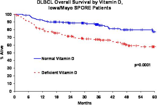 Vitamin D is a naturally occurring steroid hormone. In addition to its well-established role in maintaining serum calcium homeostasis, vitamin D has effects on cellular differentiation, proliferation, apoptosis, and angiogenesis. Vitamin D3 is naturally produced in skin in response ultraviolet-B (UVB) radiation from the sun. Several recent studies, however, have shown that a high proportion of community-dwelling subjects in both tropical and temperate climates are deficient in vitamin D, and that subjects in northern latitudes often require dietary supplementation to maintain vitamin D sufficiency. Further, several reports now suggest that vitamin D sufficiency is protective against the development of several cancers, including non-Hodgkin lymphoma (NHL). However, it is not known whether vitamin D impacts prognosis in diffuse large B-cell lymphoma (DLBCL), the most common NHL subtype.