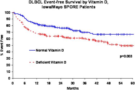 SPORE patients were primarily treated with immunochemotherapy (83%); all N0489 patients were treated with epratuzumab + R-CHOP21. The median age at diagnosis was 62 years (range, 19-93) for SPORE patients and 61 years (range, 21-82) for N0489 patients. Median follow-up for SPORE patients was 36 months (range, 1-77) with 95 deaths and 131 events; median follow-up for N0489 patients was 24 months (range, 7-39) with 13 deaths and 18 events. Vitamin D deficiency was identified in 188 SPORE patients (50%) and 15 N0489 patients (24%). There were no differences in the prevalence of vitamin D deficiency by age, IPI, or whether serum was obtained prior to starting treatment (all p > 0.28). Vitamin D deficiency was associated with inferior overall (HR=2.33, 95% CI 1.53-3.57, logrank p = 0.0001) and event-free survival (HR=1.71, 95% CI 1.20-2.44, logrank p = 0.003) in the SPORE cohort. These associations remained significant after adjusting for IPI and treatment: OS HR=1.97, 95% CI 1.27-3.07; EFS HR=1.47, 95% CI 1.02-2.21. These results were similar for the subset of SPORE patients who were treated with R-CHOP. The HRs for vitamin D deficiency and event-free survival were consistent in the N0489 patients (HR=1.63, 95% CI 0.61-4.35, IPI adjusted HR=1.43, 95% CI 0.53-3.85), although these results lacked precision due to a smaller sample size. We were unable to evaluate OS in N0489 due to the small number of deaths.